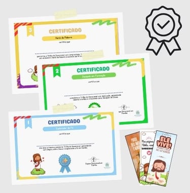 Certificados para entregar ao final da jornada, incentivando os pequenos a continuar firmes na fé.